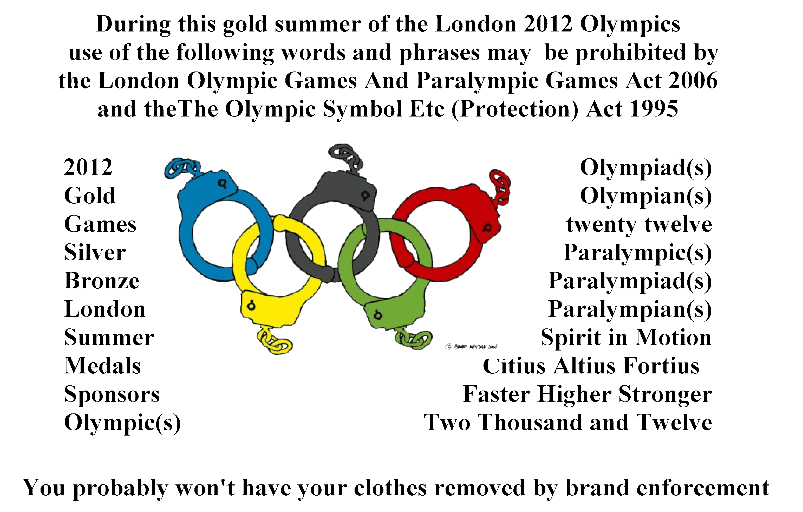 I wasn’t going to write another article about the Olympics so soon honest I wasn’t and hopefully when they actually begin I’ll shut up about them. However it’s hard to keep quiet when it’s being proposed that there will be special Olympic Offences because it’s extra bad if you break the law in a way that disrupts the Olympics. So bad in fact that the supposedly neutral CPS “may appeal over sentences for Olympic-related offences if it felt they were too lenient.” Which I think most of us these days would read as “will appeal”.